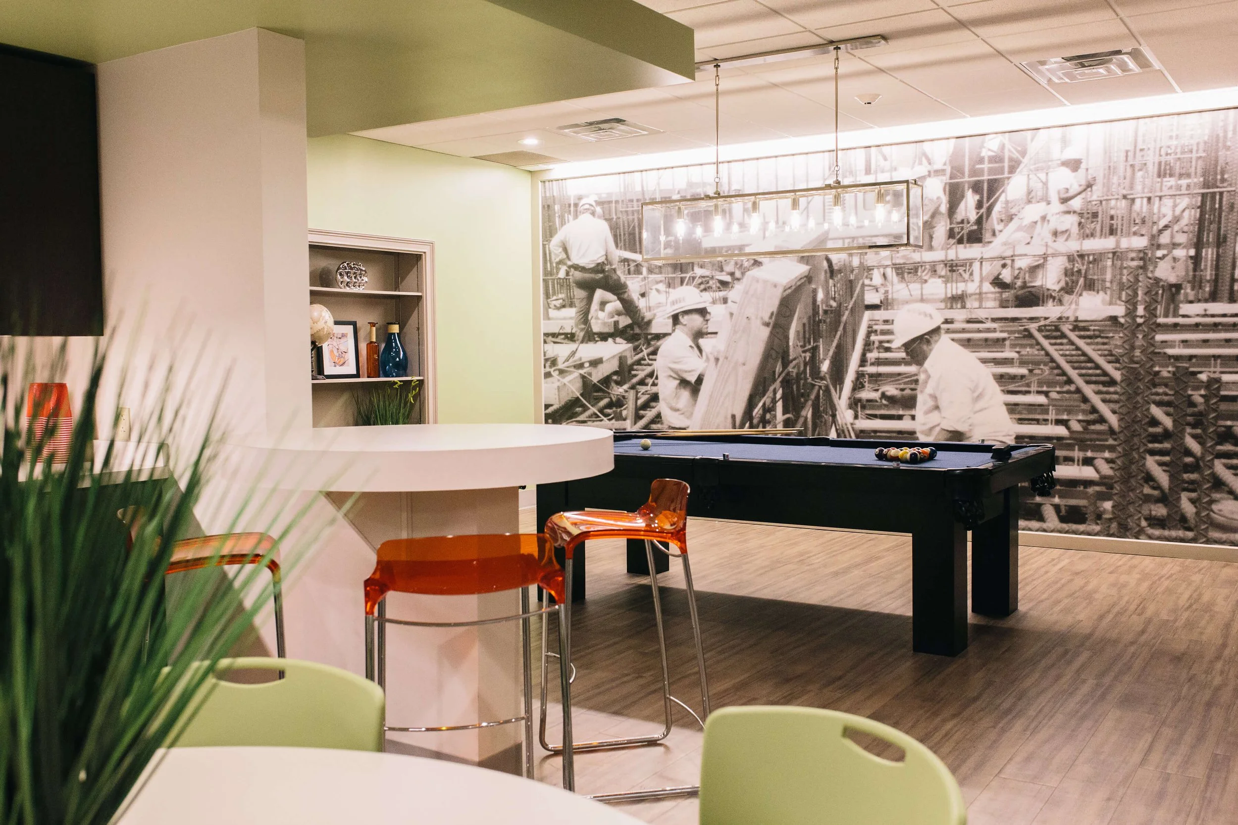 This image depicts a modern, appealing area for customers to make a good first impression. The space's pool table suggests a casual environment, and a massive black-and-white mural of construction workers lends industrial style and a sense of history or progress to high, round tables with brightly colored seats. Orange and green accents give this area energy and visual curiosity.